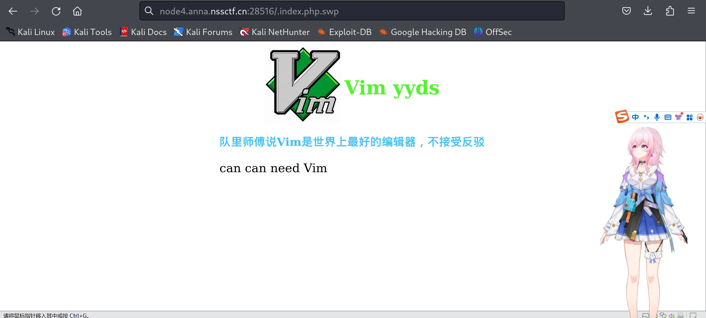 访问 .index.php.swp 后会自动下载文件,在 Kali 上用 vim 恢复: